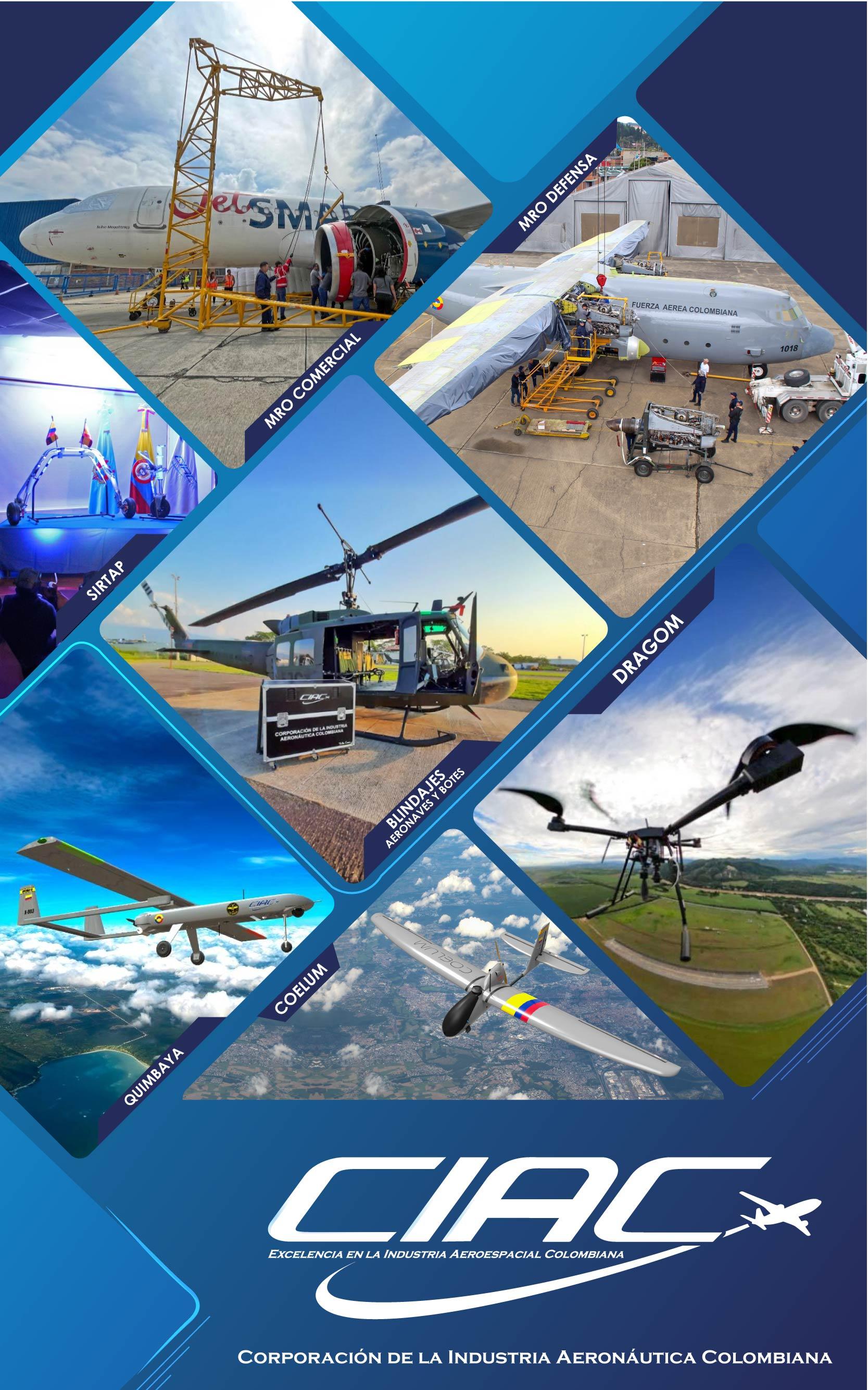 CIAC S.A. ofrece servicios de mantenimiento programado y no programado de aeronaves y componentes, fabricación de partes y sistemas de protección balística, soporte técnico especializado, así como diseño y desarrollo de aeronaves tripuladas y no tripuladas (UAV), tanto al mercado comercial como de Defensa.